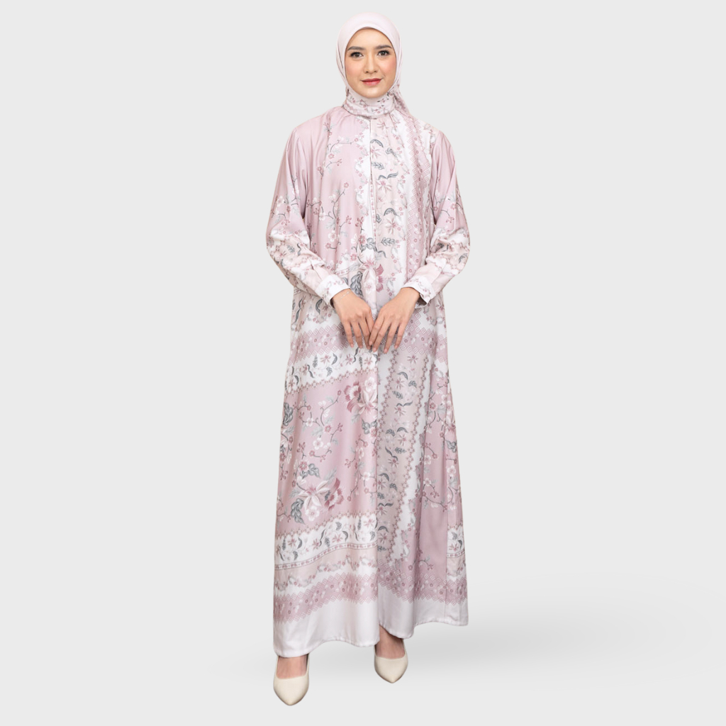 long dress dngan nuansa printed blossom mauve yang lembut dan detail simetris yang memberikan kesan klasik